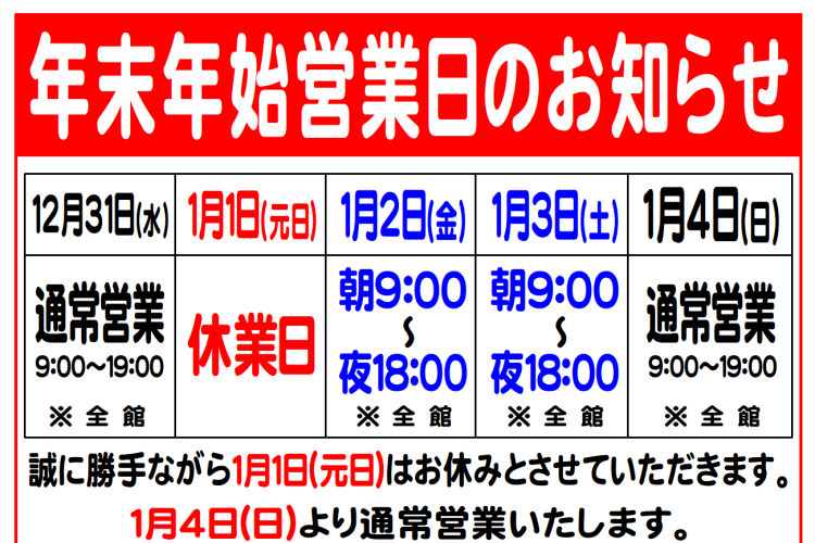 お知らせ HOMEお知らせ石下店ホームセンター すべて お知らせチラシ 2025.12.12 お知らせ 年末年始営業時間のお知らせ 2025.05.31 お知らせ 防犯対策 2025.03.10 お知らせお知らせ 【サイクル・園芸機械】修理作業工賃の価格改定のご案内 2025.01.03 お知らせ ペットフェア開催!ペットの似顔絵 御予約待ってます! 2024.11.10 お知らせ お団子 好文堂出張販売会 開催 2024.10.24 お知らせ イベント案内 2024.10.12 お知らせ イベント案内 2024.10.09 お知らせ イベント案内 2024.06.16 チラシ 宅配ボックス特集 12次へ